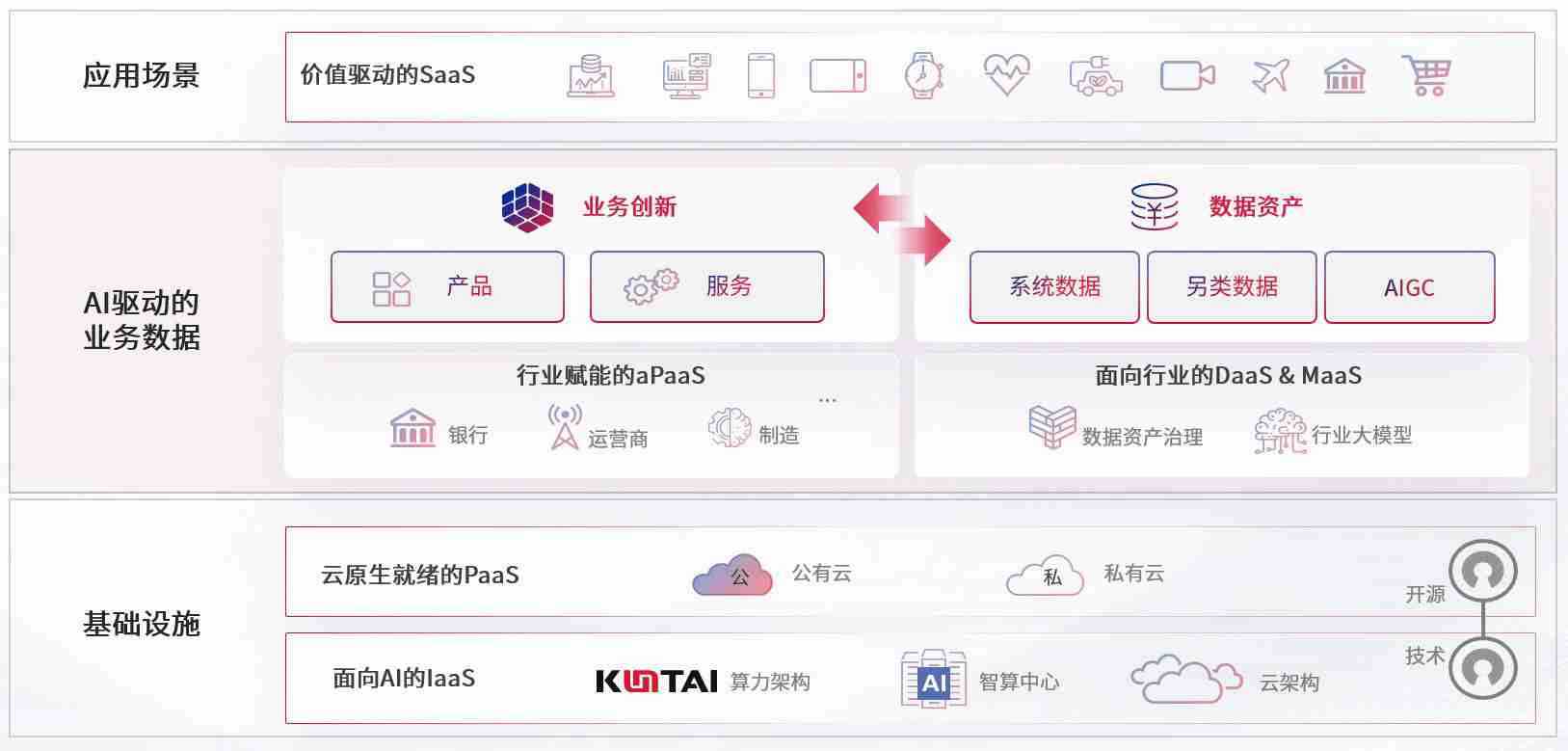数字时代,,围绕企业数字化转型的关键要素,,尊龙z6数码开创性的提出数云融合战略和技术体系框架,,着力在云原生、、数字原生、、AI原生和信创产业上架构产品和服务能力,,为处在不同数字化转型阶段的快消零售、、汽车、、、、金融、、、、医疗、、、、政企、、、教育、、运营商等行业客户提供泛在的敏捷IT能力和融合的数据驱动能力,,,构建跨界融合创新的数字业务场景和新业务模式,,,助力企业级客户建立面向未来的核心能力和竞争优势,,全面推动社会的数字化、、、智能化转型升级。。。。