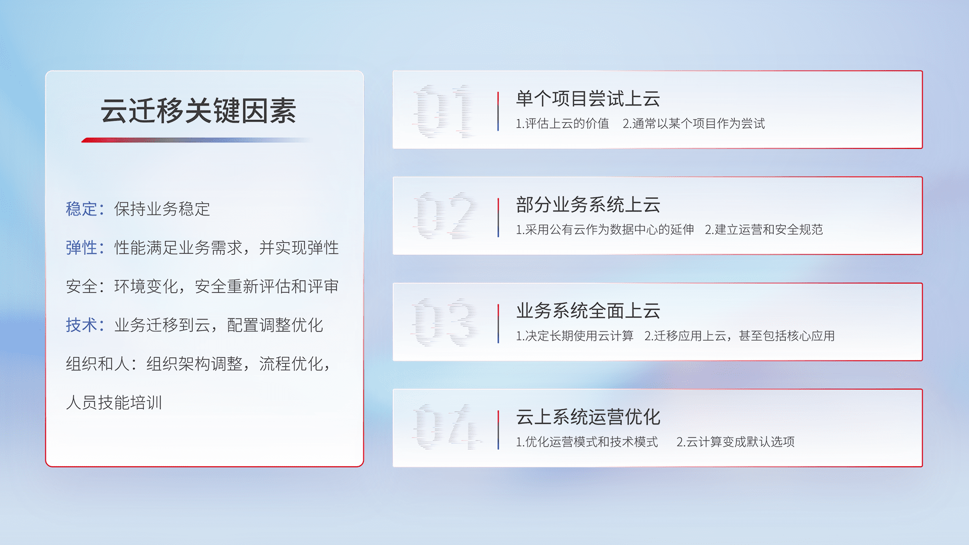 结合实际业务,,,从规划设计、、、、云平台选型、、云原生改造、、、、数据迁移、、集成交付,,,,迁移全过程为客户识别最佳上云路径,,做好风险识别管理,,,设计网络架构、、、身份权限、、、安全审计合规、、操作审计、、日志审计、、监控告警策略、、、、多站点容灾设计等,,对云上基础设施进行整体规划,,,,提升IT治理水平,,,以满足弹性、、、高可用、、、、高性能的需求。。