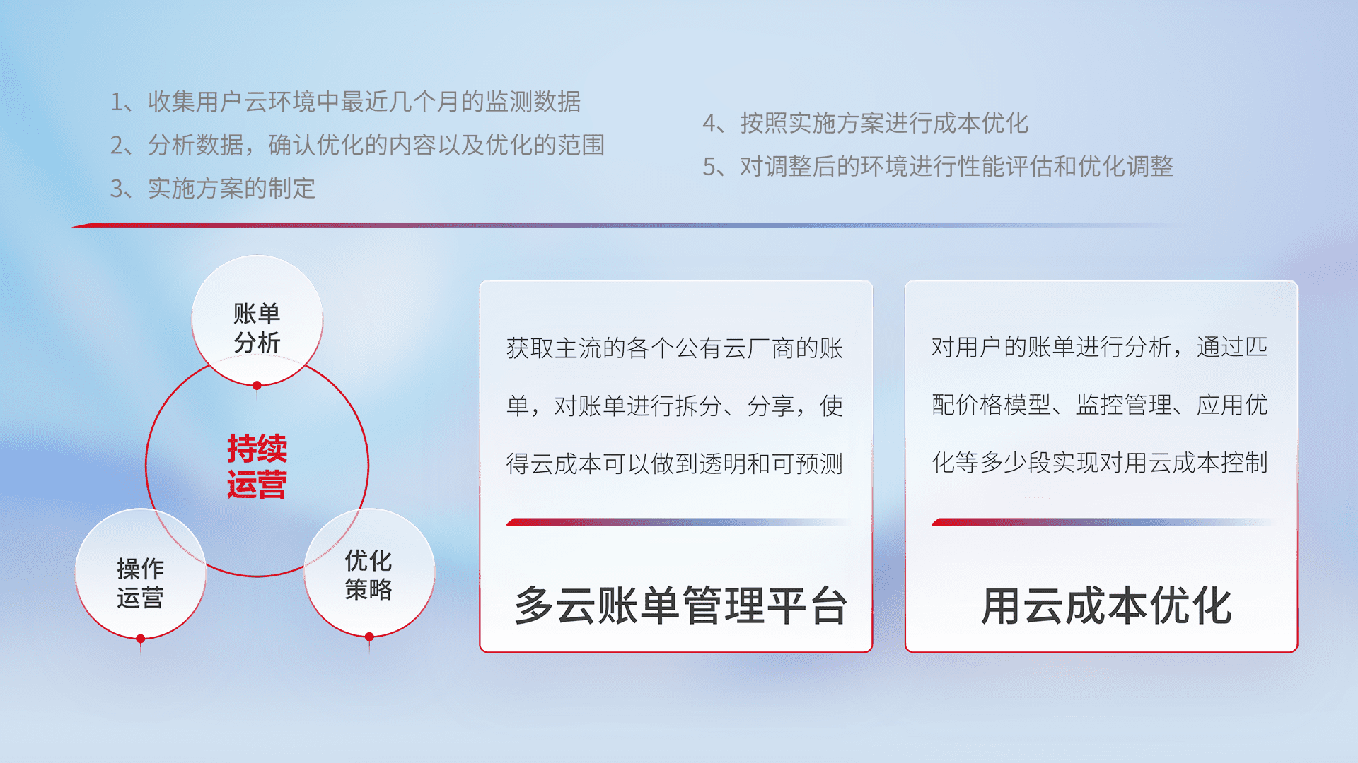 通过多云纳管,,以统一的资源数据模型把客户的云资源进行抽象和封装,,,进而实现对多云资源的统一操作,,,保障云资源管理的可靠性、、稳定性与可用性。。。。量身定制化运维内容,,,配置、、开发运维、、、补丁管理、、、备份、、、、监控、、、认证和访问管理、、、审计和日常巡检等,,,,保障在用云过程中的可靠度,,稳定度以及高可用率。。。。